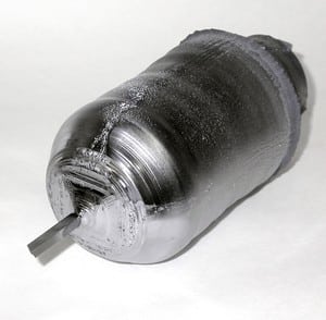Kryształ arsenku galu wyhodowany w Instytucie Technologii Materiałów Elektronicznych w Warszawie. Widoczny pręt, za pomocą którego kryształ był wyciągany z wnętrza tygla. (Źródło: ITME)