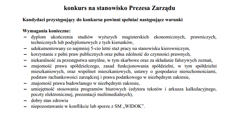 Na stronie SM Widok pojawiło się ogłoszenie dotyczące naboru na stanowisko prezesa Spółdzielni.