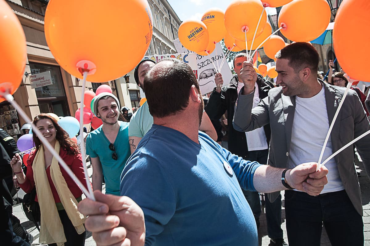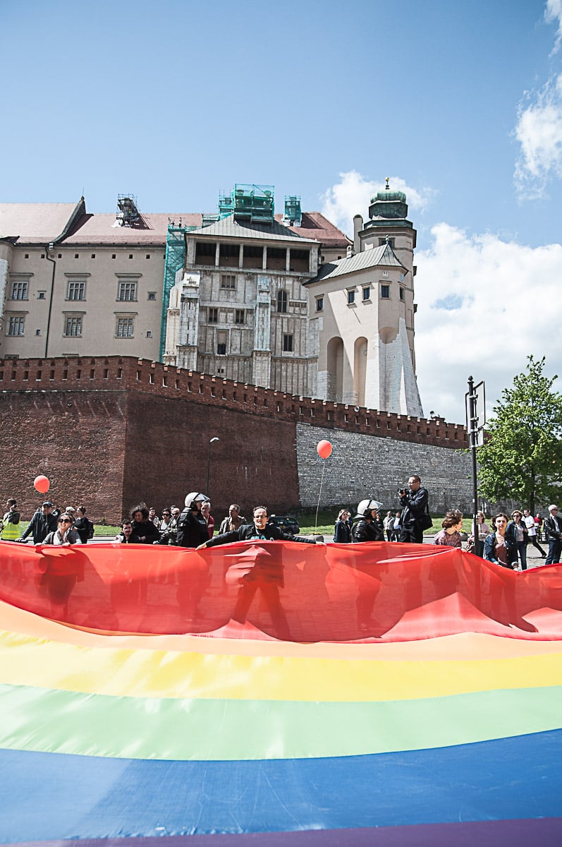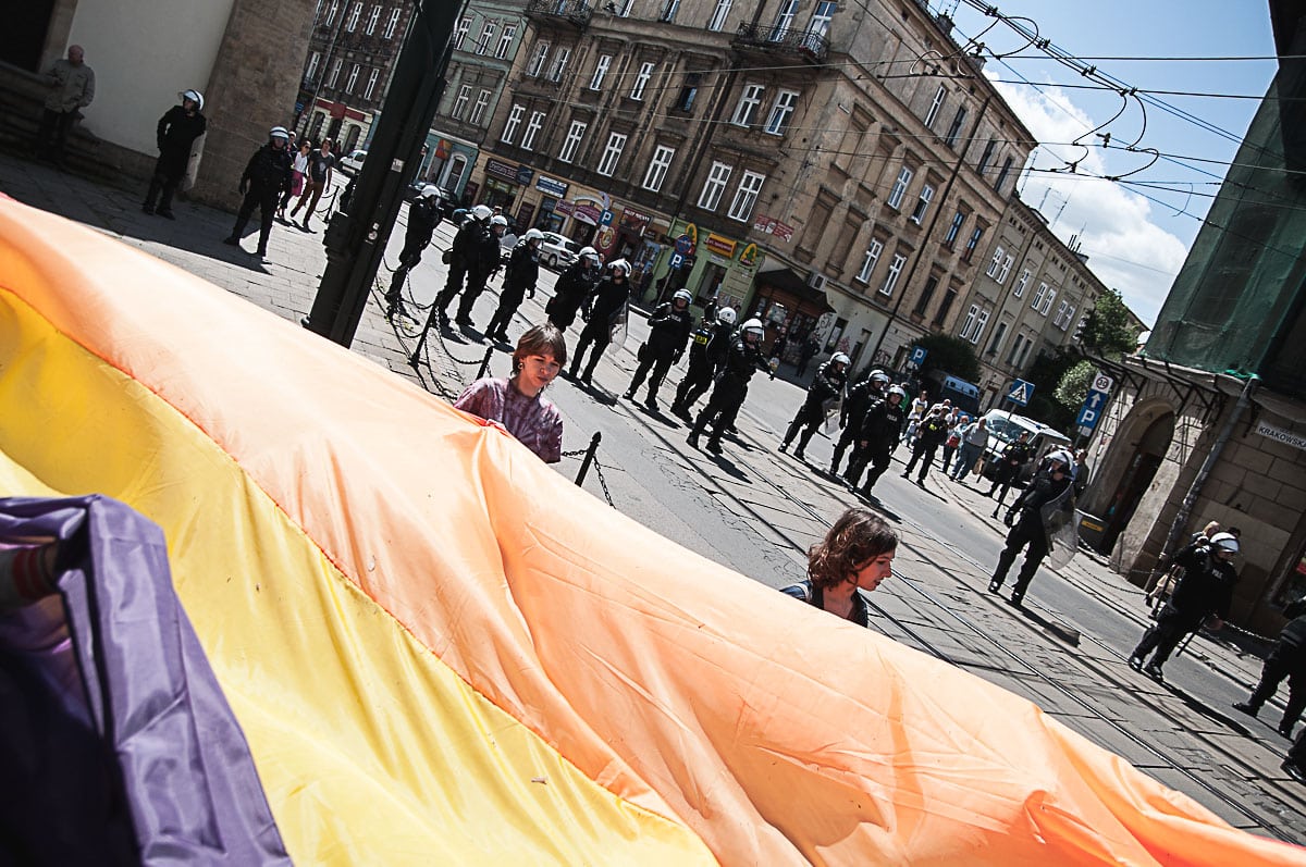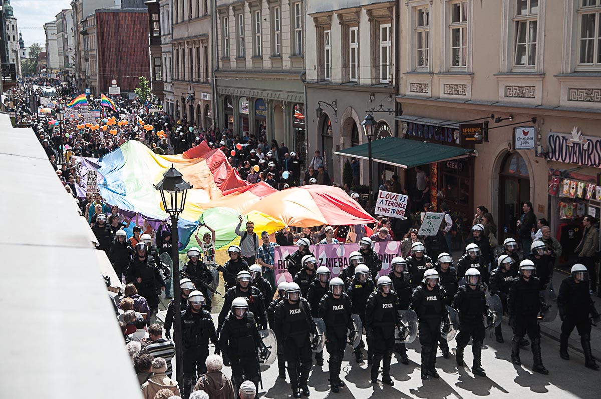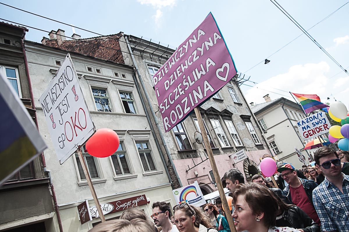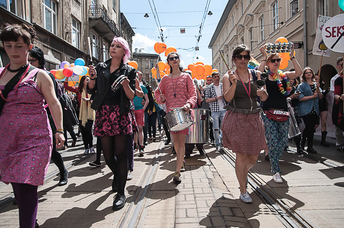 Każdy ma swój Gender! Taki transparent wypatrzyłem w tłumie ludzi, którzy wzięli udział w tegorocznym Marszu Równości. To już dziesiąty taki marsz w Krakowie. Z tęczową “sektorówką” w rytmie bębnów i gwizdków, wznosząc okrzyki “dziewczyna! dziewczyna – szczęśliwa rodzina” , kilkaset osób przemaszerowało z placu Wolnica na plac Szczepański, żeby zamanifestować swoją tolerancyjność i solidarność z osobami LGBT . Było kolorowo, wesoło, i pozytywnie, a po drodze była… policja, policja, policja, narodowcy, policja, narodowcy i znowu policja.