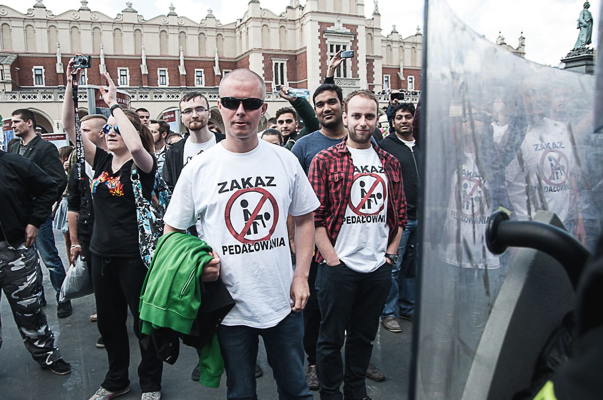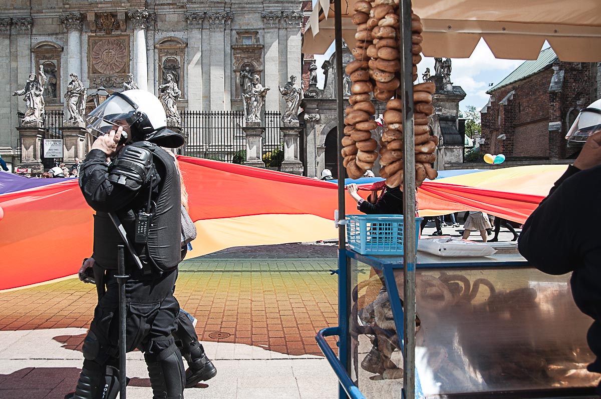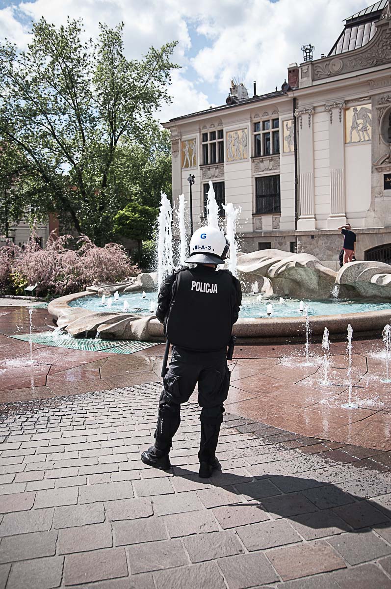 Potem był Rynek, tam policja. Na Grodzkiej więcej policji. Pod koniec Grodzkiej jeszcze więcej policji, straż miejska, “czarni” w pełnym rynsztunku i trochę nielatów z patriotycznymi napisami na bluzach i T-shirtach, których gonili tamci “czarni”. Będzie ciekawie pomyślałem sobie po raz kolejny. I analizuję… jak ci “Tęczowi” przyjdą od strony Stradom, to pewnie tutaj będą czekać na nich “Narodowcy”, bo przecież pod wawelem jest i Wawel – to primo i krzyż katyński – to secundo, wiec jest czego bronić, prawda? To tutaj kilka lat temu w ferworze walki z jednej strony na drugą stronę, do dziś zresztą nie ustalono z której ze stron, w tłum poleciał słynny na całą Polskę zdechły kot…. Przeliczyłem się jednak, tym razem pod krzyżem nie było “zwarcia”. “Zwarcie” było na Rynku ale….