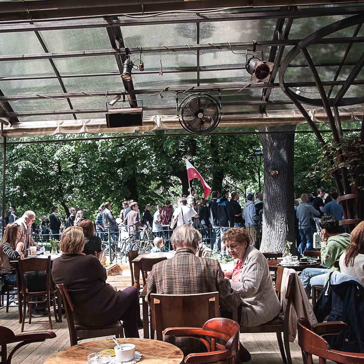 - Narodowcy pod Bunkrem Sztuki, gdzie zablokowała ich policja. Klienci raczą się kawą. fot. jakub włodek