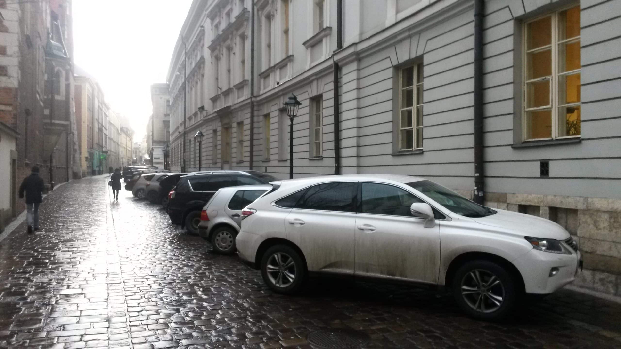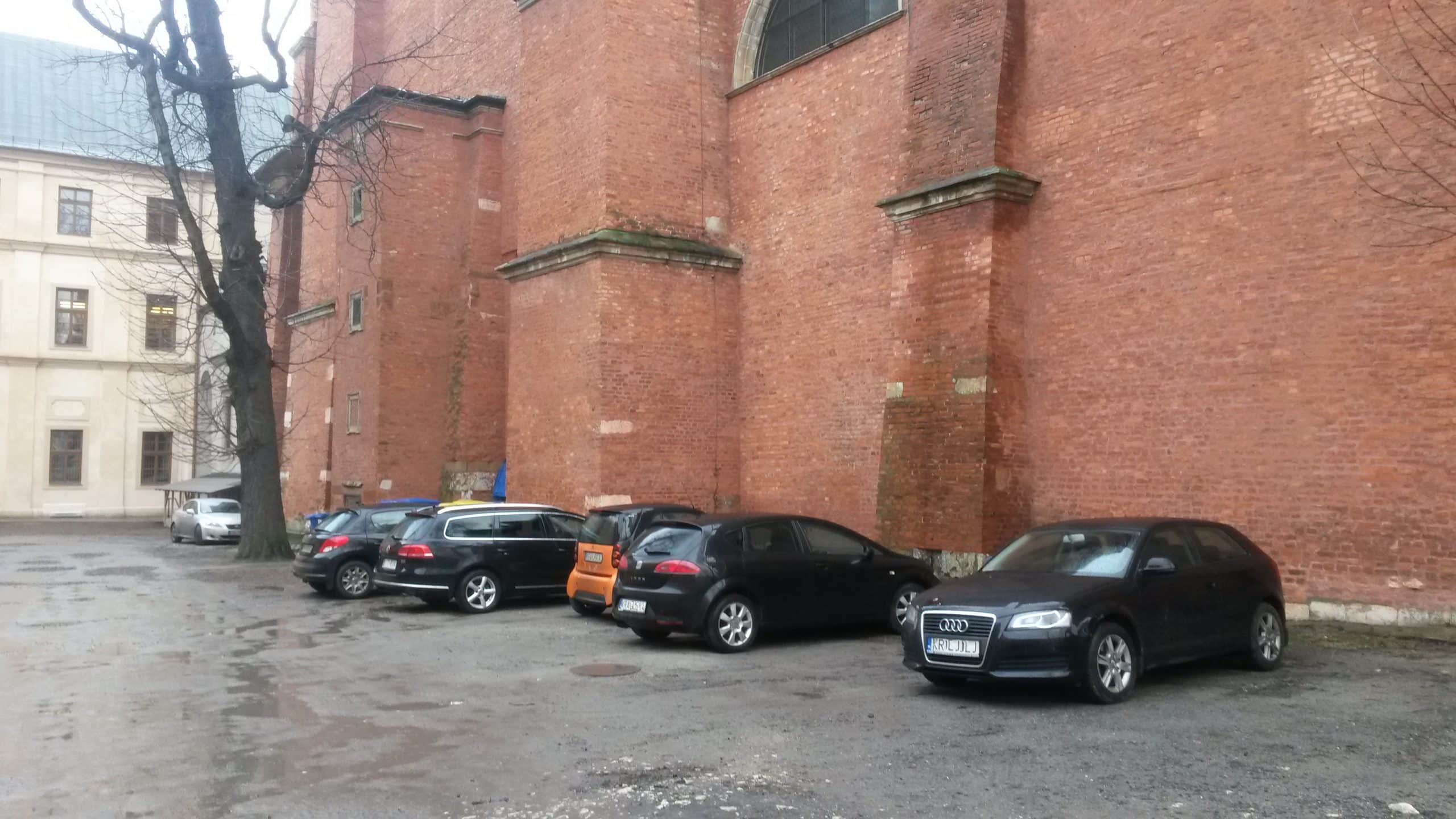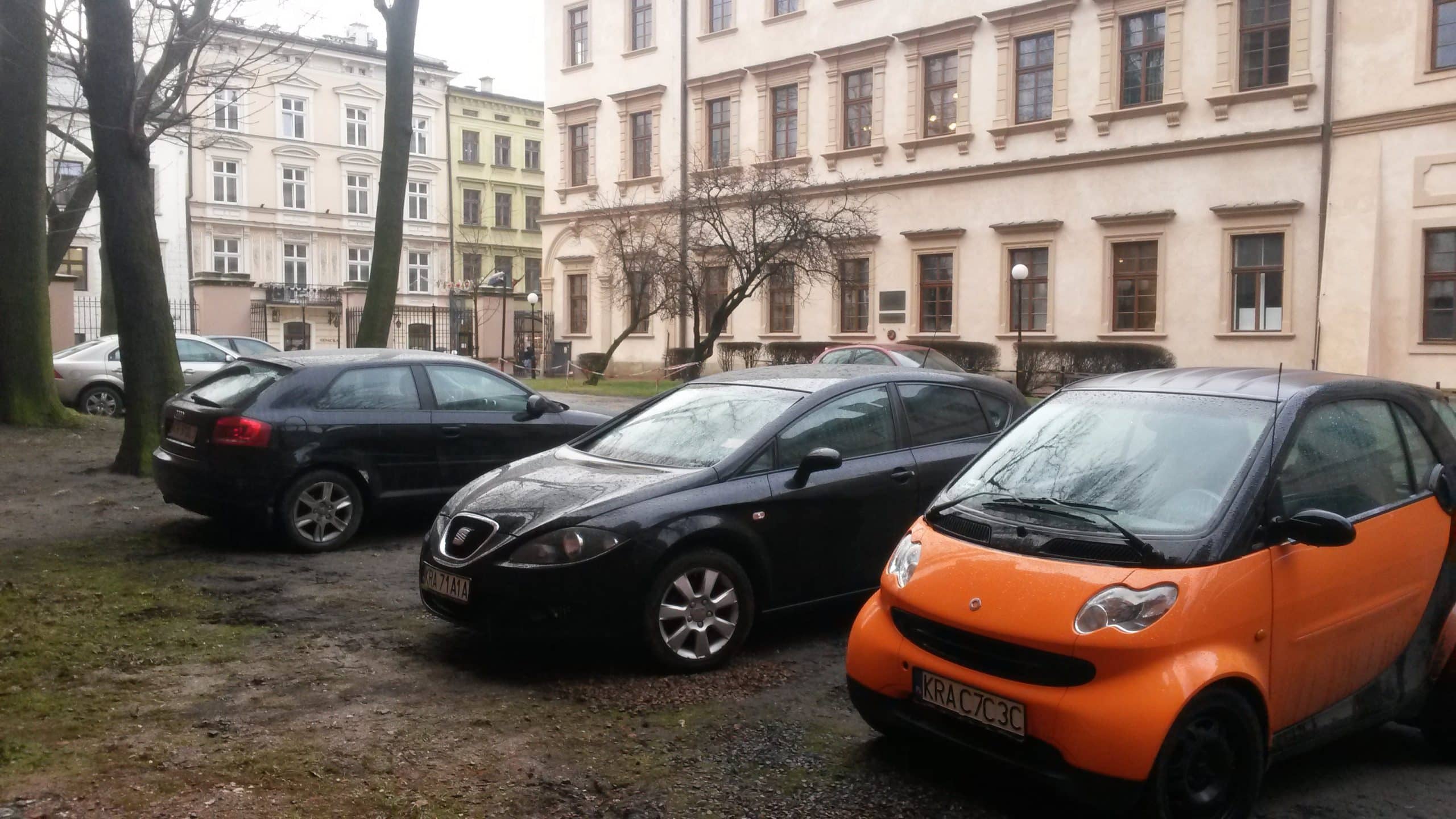 Kamień wielkości kostki brukowej z płyty Rynku spadł mi z serca, kiedy wszedłem na dziedziniec Wydziału Filozoficznego Uniwersytetu Jagiellońskiego przy ulicy Grodzkiej 52. Bałem się, że będą tam ławki, trawa albo – nie daj Boże – coś w rodzaju skweru lub nawet parku. Moje obawy okazały się zupełnie bezpodstawne. Trawa co prawda kiedyś była, ale została już rozjechana przez koła samochodów. Płyny spod maski i sól drogowa spływająca z karoserii też zapewne pomogły w wyplenieniu zielonej zarazy. Ciężkie samochody najbardziej światłych mieszkańców Krakowa wyżłobiły w terenie – na którym kiedyś rosła trawa – dziury. Co większe “ubytki” powierzchni biologicznie (tfu!) czynnej zasypano… żwirem. Dzięki temu trawa nie urośnie już nigdy, a wykładowcy zaparkują pod miejscem pracy w miarę komfortowo. Co ciekawe, pod Collegium Broscianum dojechać można tylko ulicą Grodzką. Teoretycznie akurat ta część ulicy jest wyłączona z ruchu. Teoretycznie.