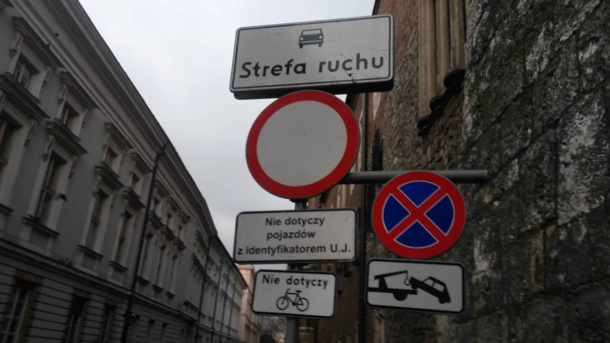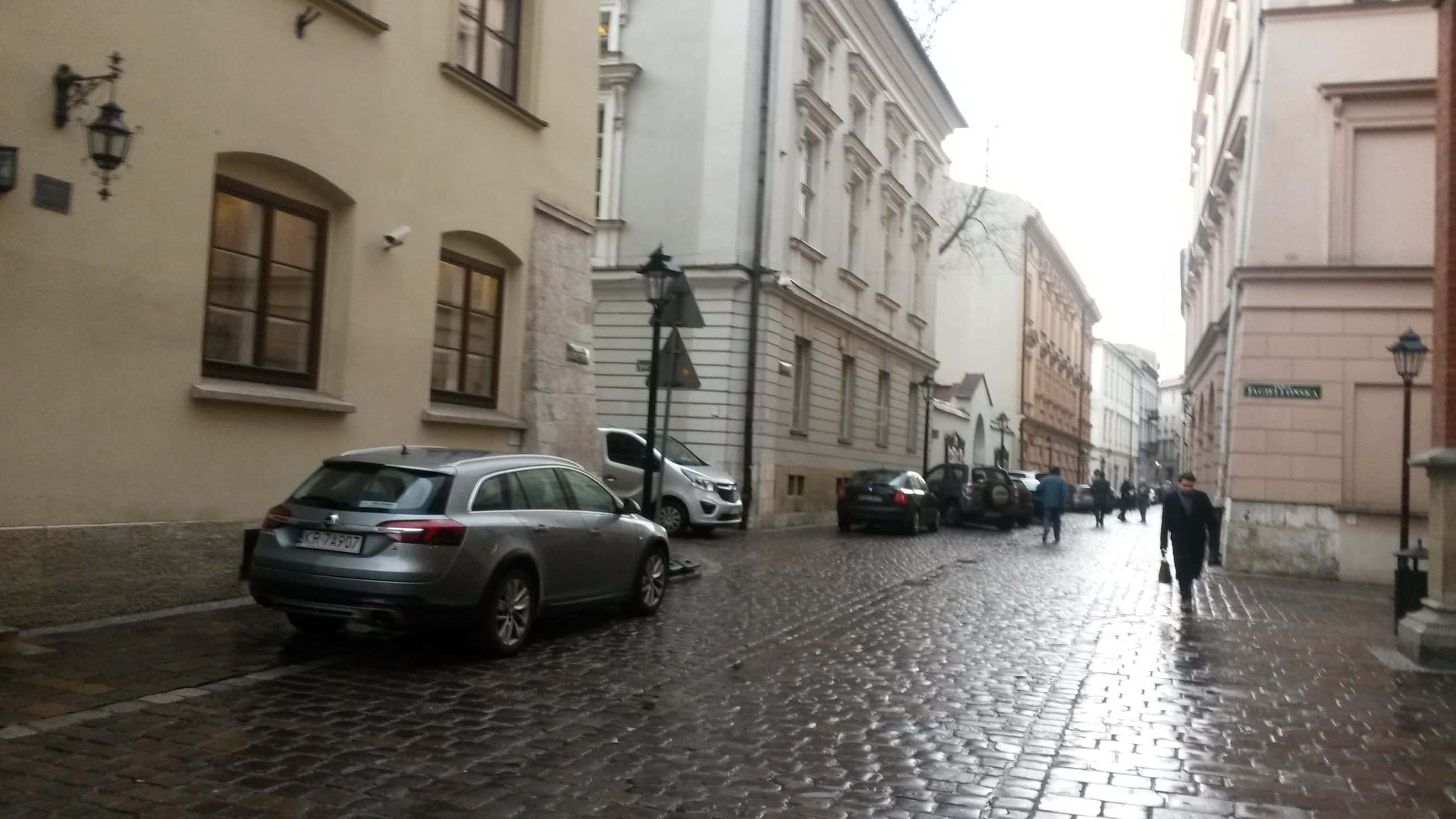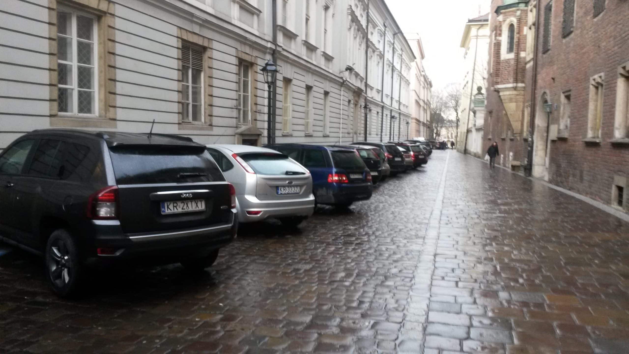 Kamień wielkości kostki brukowej z płyty Rynku spadł mi z serca, kiedy wszedłem na dziedziniec Wydziału Filozoficznego Uniwersytetu Jagiellońskiego przy ulicy Grodzkiej 52. Bałem się, że będą tam ławki, trawa albo – nie daj Boże – coś w rodzaju skweru lub nawet parku. Moje obawy okazały się zupełnie bezpodstawne. Trawa co prawda kiedyś była, ale została już rozjechana przez koła samochodów. Płyny spod maski i sól drogowa spływająca z karoserii też zapewne pomogły w wyplenieniu zielonej zarazy. Ciężkie samochody najbardziej światłych mieszkańców Krakowa wyżłobiły w terenie – na którym kiedyś rosła trawa – dziury. Co większe “ubytki” powierzchni biologicznie (tfu!) czynnej zasypano… żwirem. Dzięki temu trawa nie urośnie już nigdy, a wykładowcy zaparkują pod miejscem pracy w miarę komfortowo. Co ciekawe, pod Collegium Broscianum dojechać można tylko ulicą Grodzką. Teoretycznie akurat ta część ulicy jest wyłączona z ruchu. Teoretycznie.