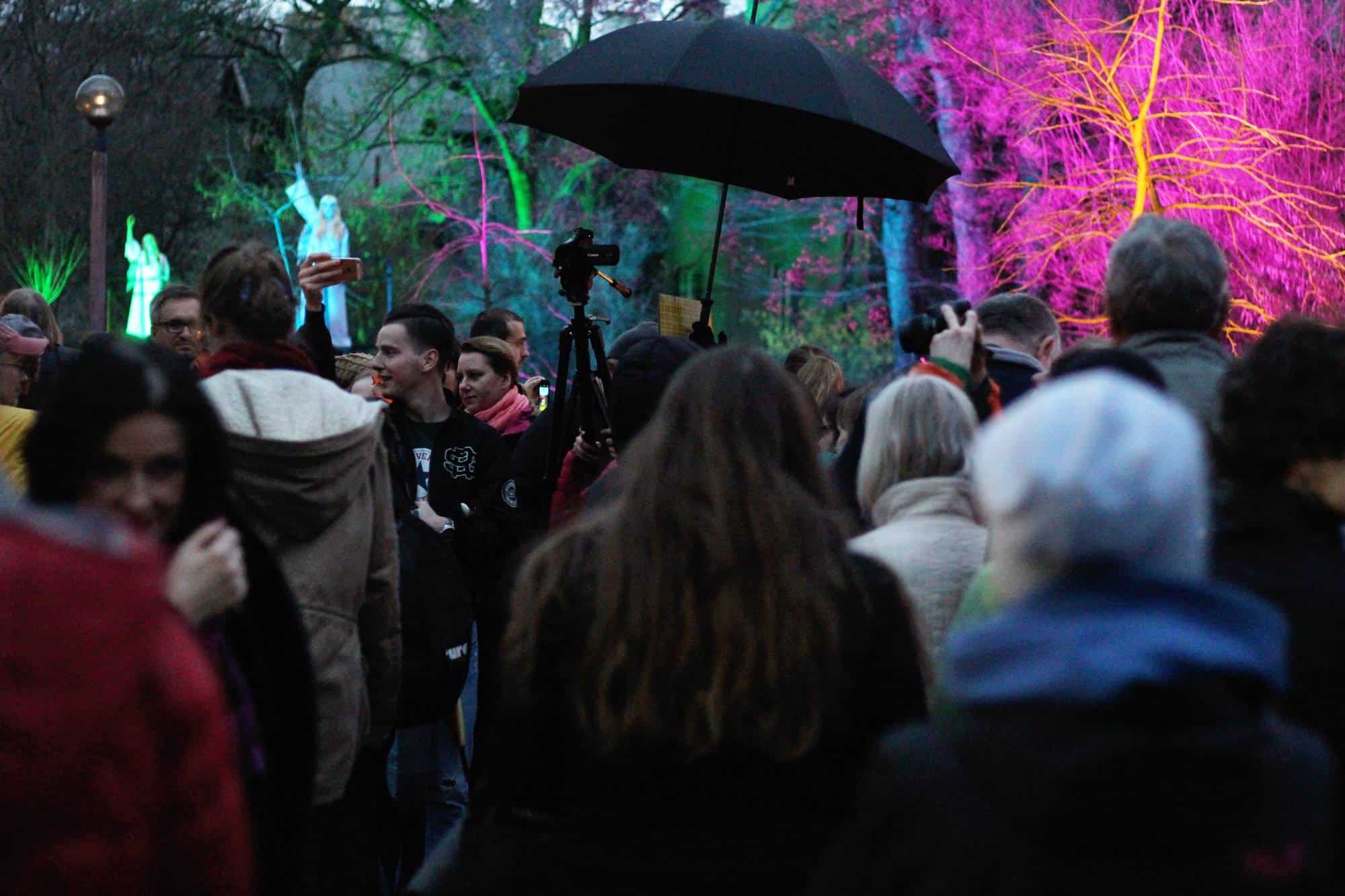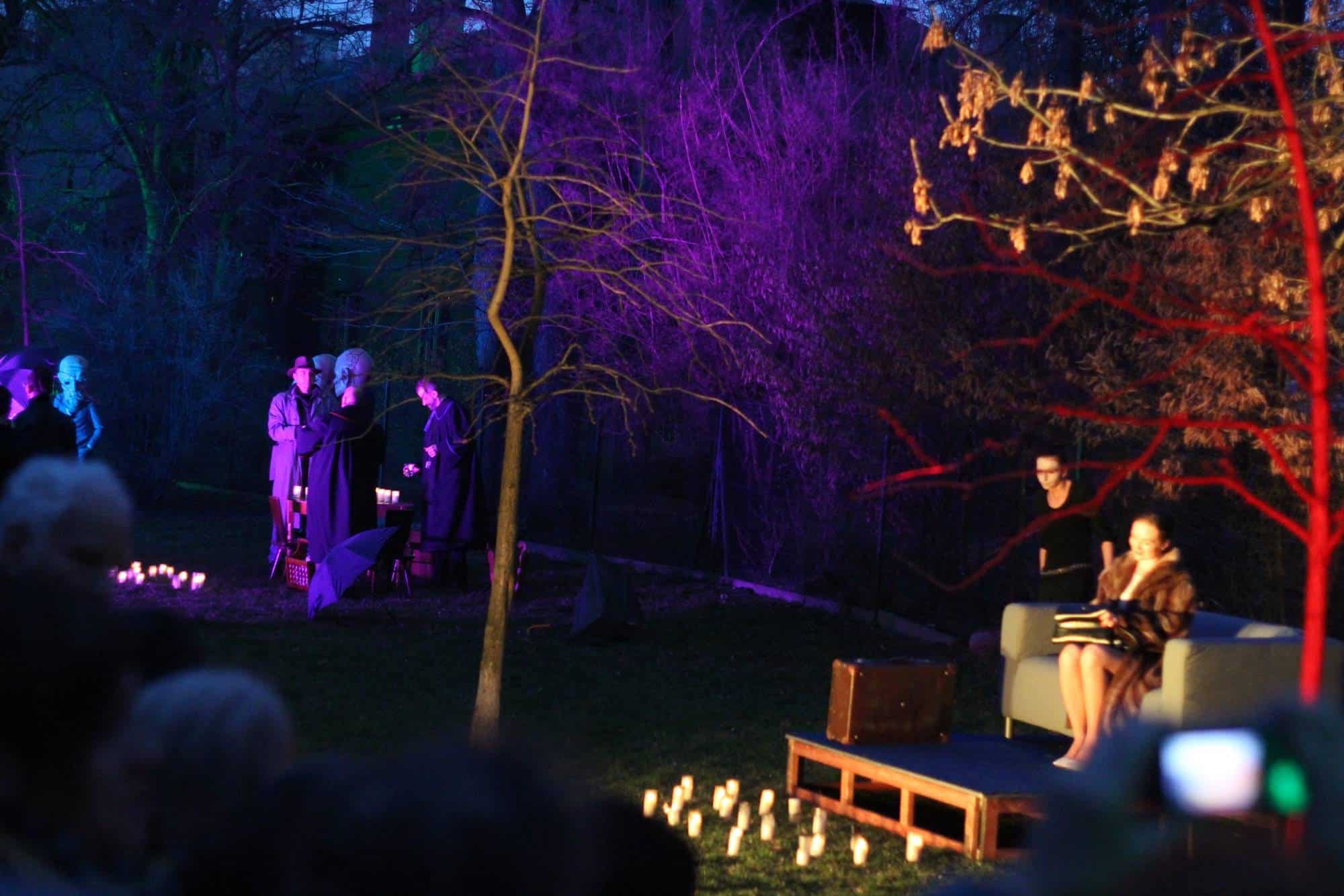 Na scenie widowiska, czyli trawniku przy al. Grottgera (od narożnika Gzymsików), zaprezentowane zostały scenografie, kostiumy i ubrane w nie postaci z przedstawień KTO. Goście, uprzednio poproszeni o przyniesienie białych zniczy, mogli je zapalić dla uczczenia pamięci miejsca, które było siedzibą Teatru przez prawie czterdzieści lat.