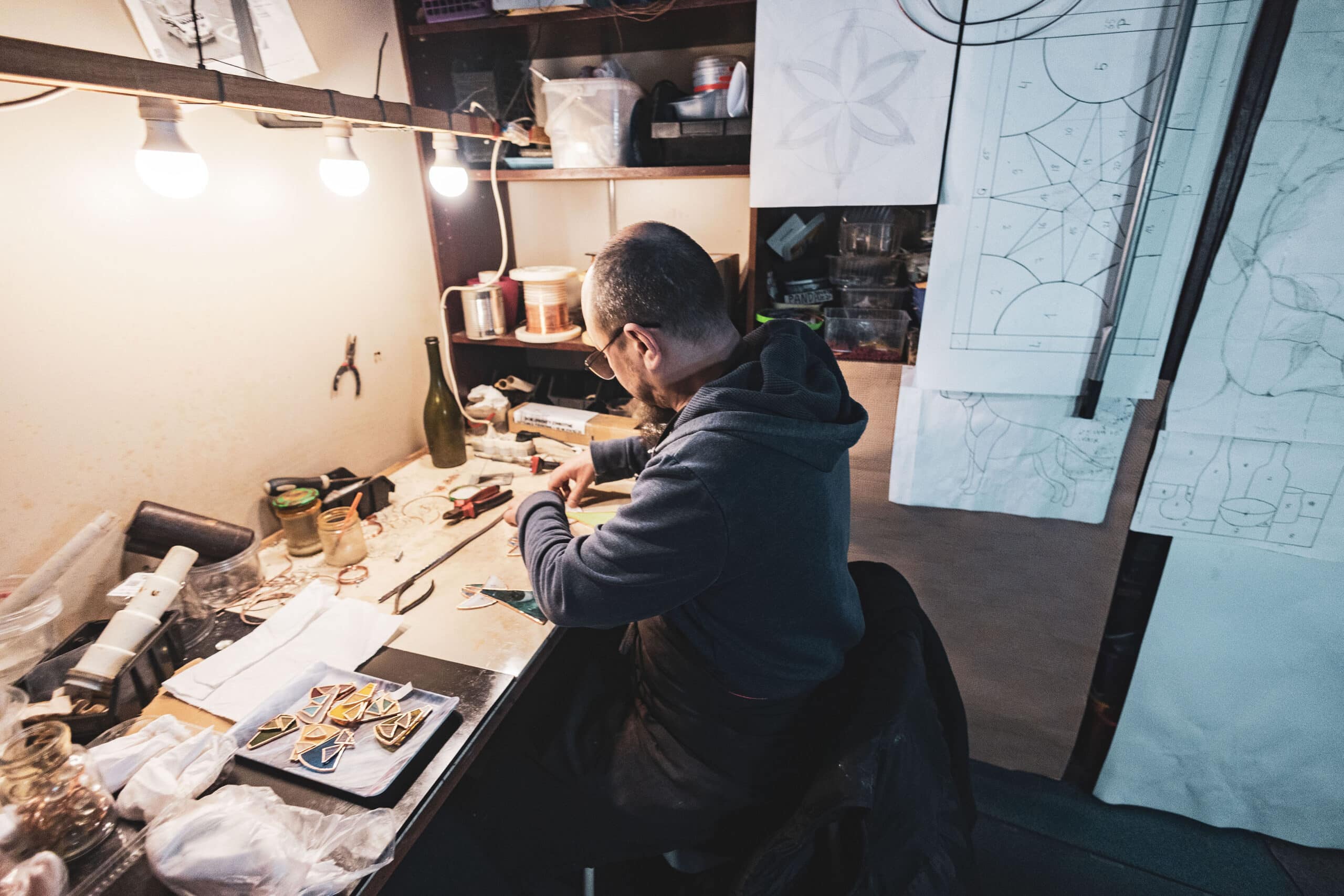 Najpierw jest projekt — rysujemy szkic, często wspólnie z klientem. Potem tniemy szkło na kawałki, każdy element szlifujemy, oklejamy taśmą miedzianą i lutujemy cyną. Na koniec patynujemy i polerujemy, by uzyskać odpowiedni połysk. Używamy techniki Tiffany’ego — to daje ogromną precyzję, szczególnie w mniejszych formach, takich jak lampy czy dekoracje. Wymaga to dużego stołu roboczego, osobnej pracowni i sprzętu — bo lutowanie to opary, szlifowanie szkła to hałas. Mała pracownia nie wystarczy — potrzeba miejsca na tafle szkła, narzędzia i bezpieczne warunki pracy.