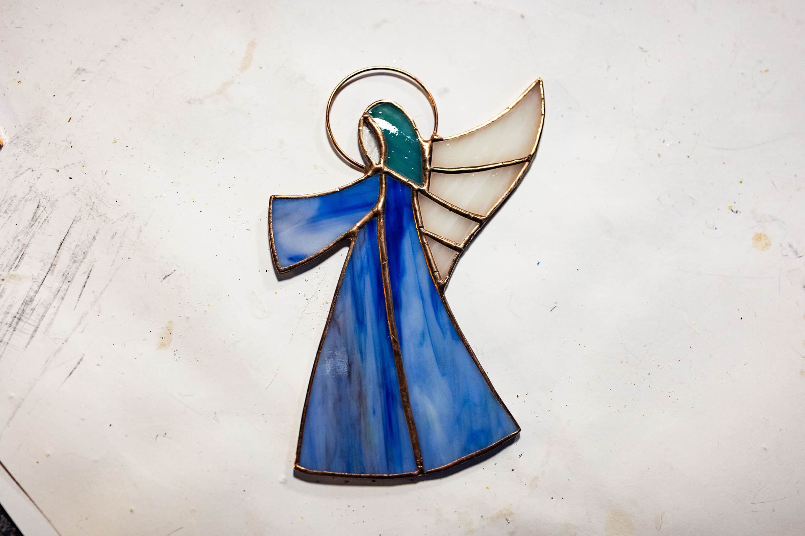 Tak. Zdarza się, że wymieniamy pęknięte kawałki szkła — szczególnie, jeśli witraż był zrobiony techniką Tiffany’ego. A jak poznać, czy witraż jest wykonany profesjonalnie? Po lutach – jeśli łączenia są nierówne, wybrzuszone, to znak, że coś poszło nie tak. U nas patynujemy cynę — daje to elegancki efekt. Kiedyś zostawialiśmy cynę białą, ale najbardziej cenię ją w miedzianej oprawie — szczególnie w aniołkach.