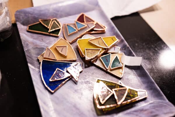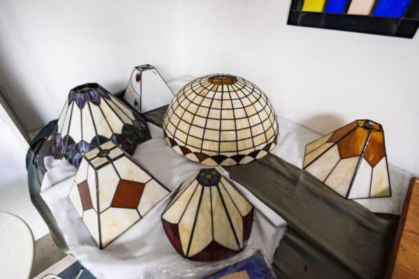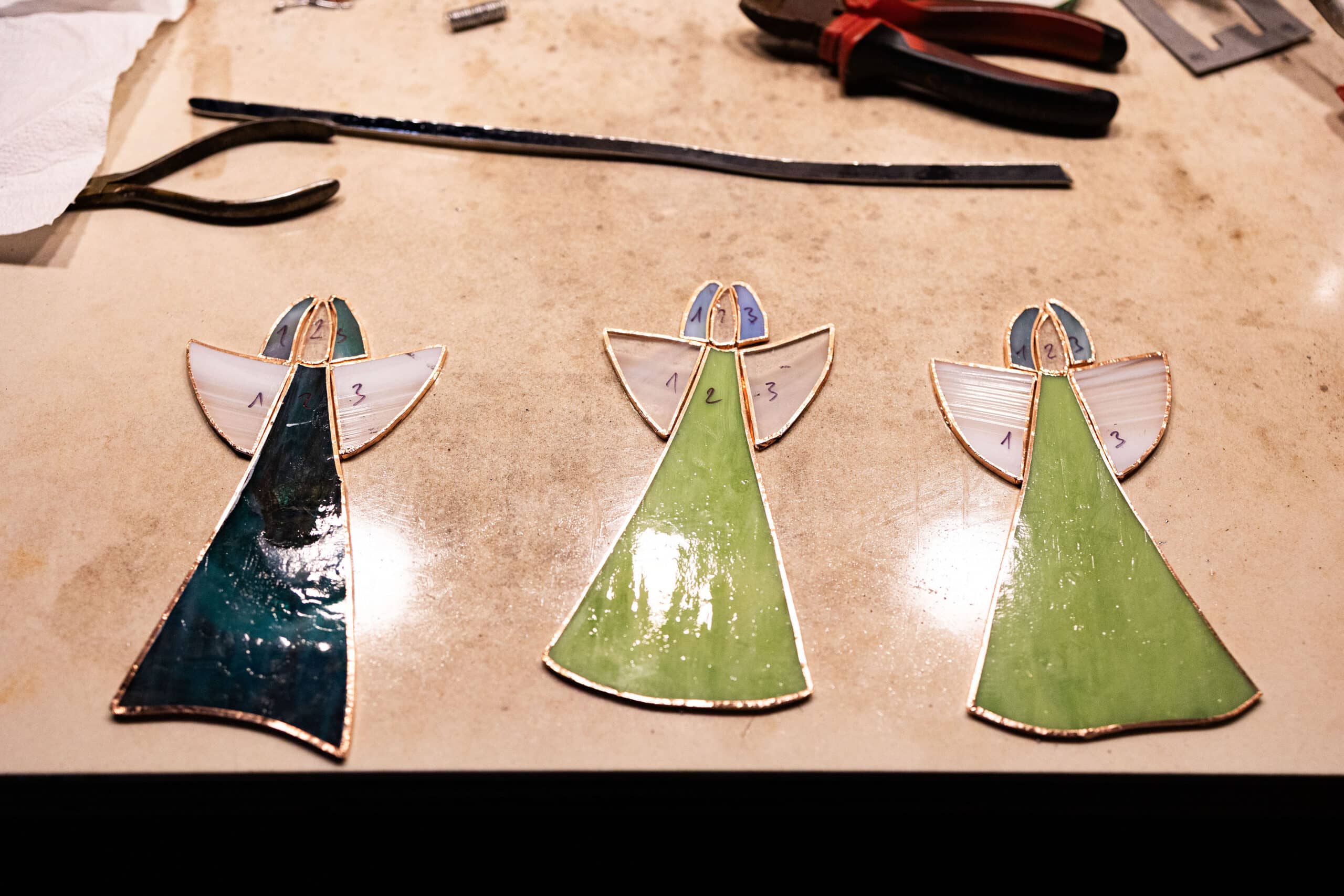 U nas to klasyka: noże do cięcia szkła, szlifierki, lutownice. Technika Tiffany’ego nie zmienia się od dekad — robimy wszystko ręcznie, bez skrótów. Choć czasem eksperymentujemy z nowymi fakturami szkła, fundament pozostaje ten sam. W 99% — tradycja. Nowoczesność to jedynie nowe rodzaje szkła, ich faktury i barwy, ale sam proces pozostaje rzemieślniczy.