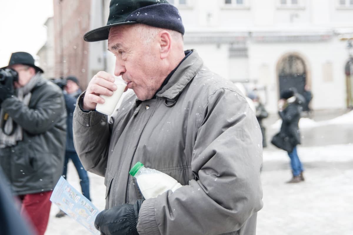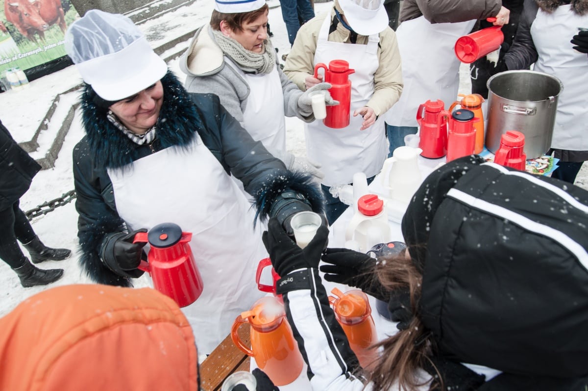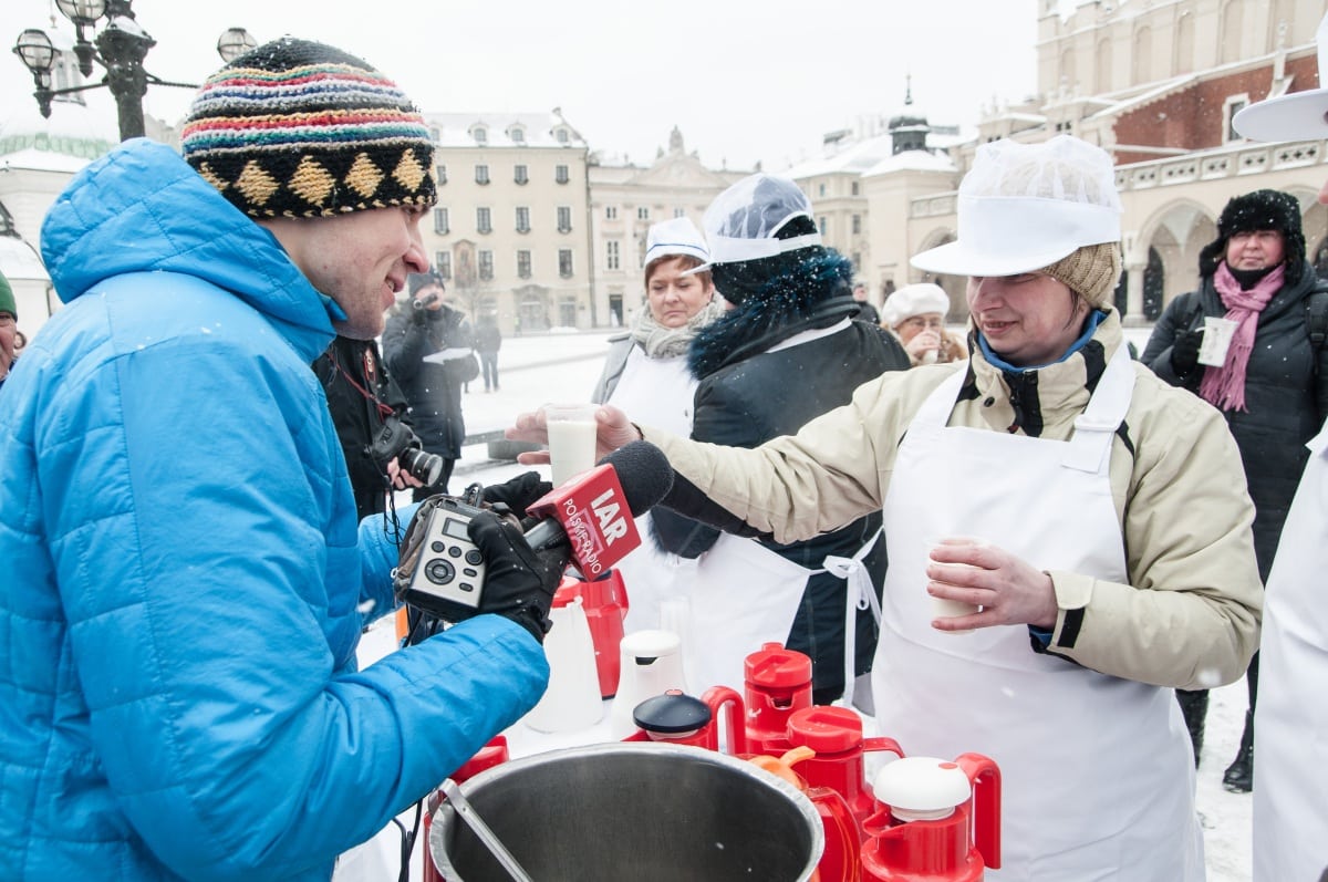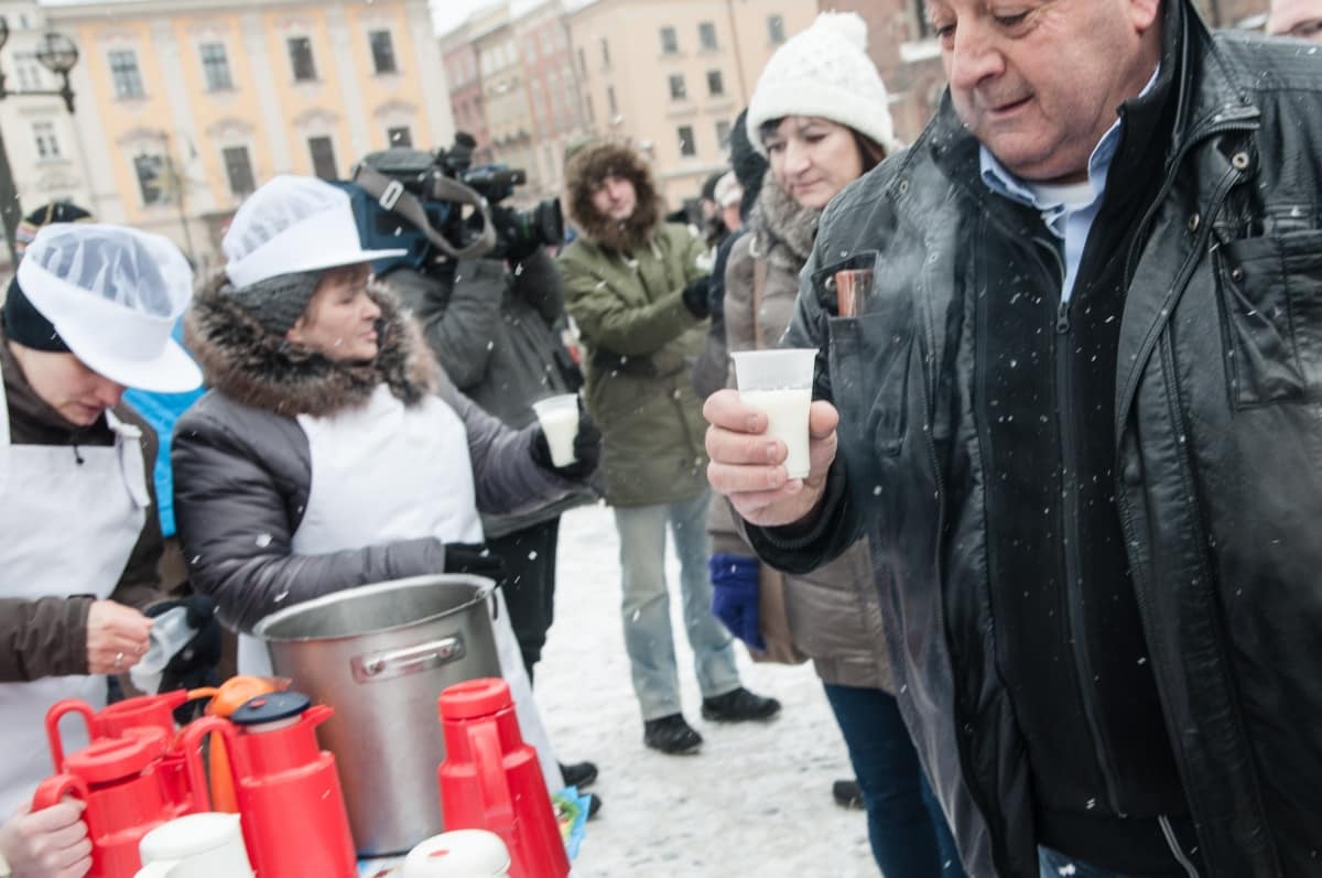 To był prewencyjny protest – przeciwko zapowiadanym przez ministra finansów cięciom dotacji dla barów mlecznych. W obronie tych skansenów polskiej kuchni tłumnie – mimo trzaskającego mrozu – stawiło się kilkadziesiąt osób. Pili ciepłe mleko przygotowane specjalnie na tę okazję przez spółdzielnie mleczarską. – Następnym razem przywiozę większe bańki, takie na 100 litrów – mówi Władysław Kapitan – prezes spółdzielni. Jest dostawcą mleka do wielu krakowskich barów mlecznych i do protestu nie trzeba było go dwa razy namawiać. – Następnym razem to wjedziemy tu cysterną z mlekiem, jeśli będą chcieli zamknąć nasze „mleczniaki” – odpowiadam prezesowi, któremu pomysł chyba się spodobał.