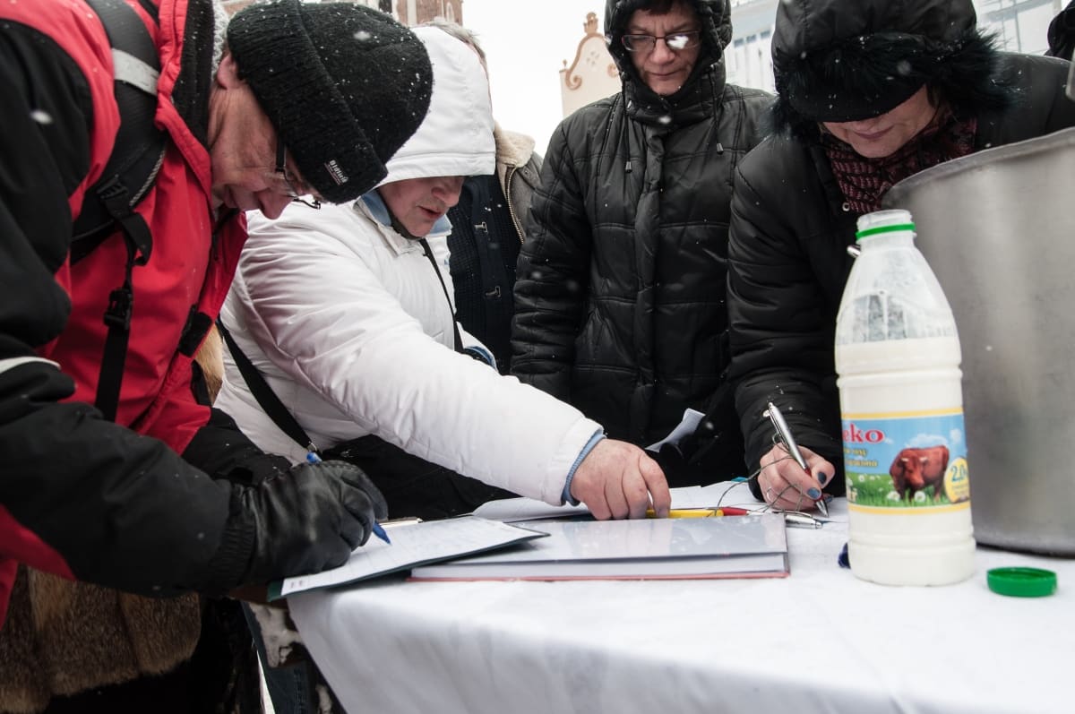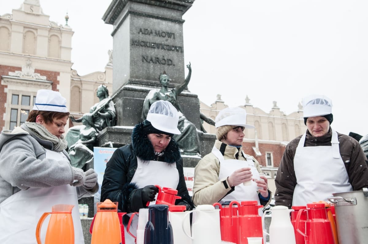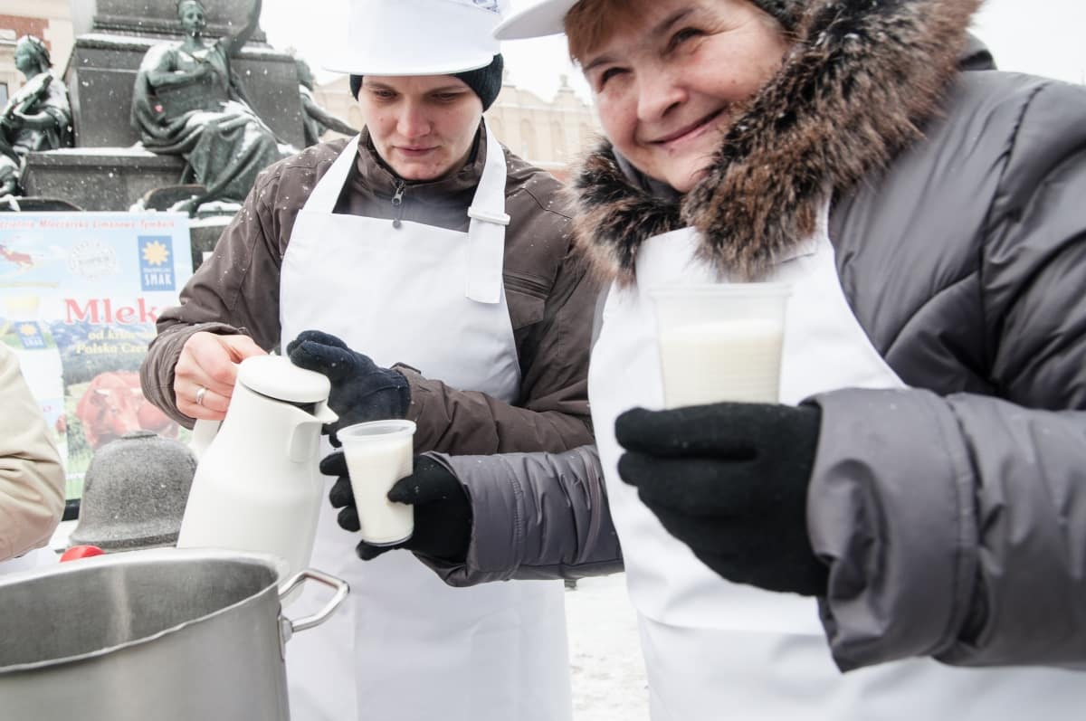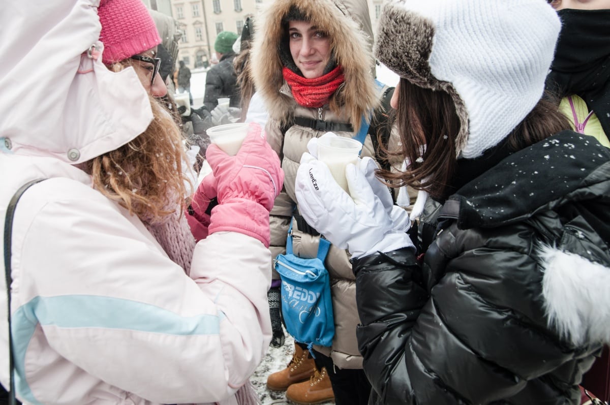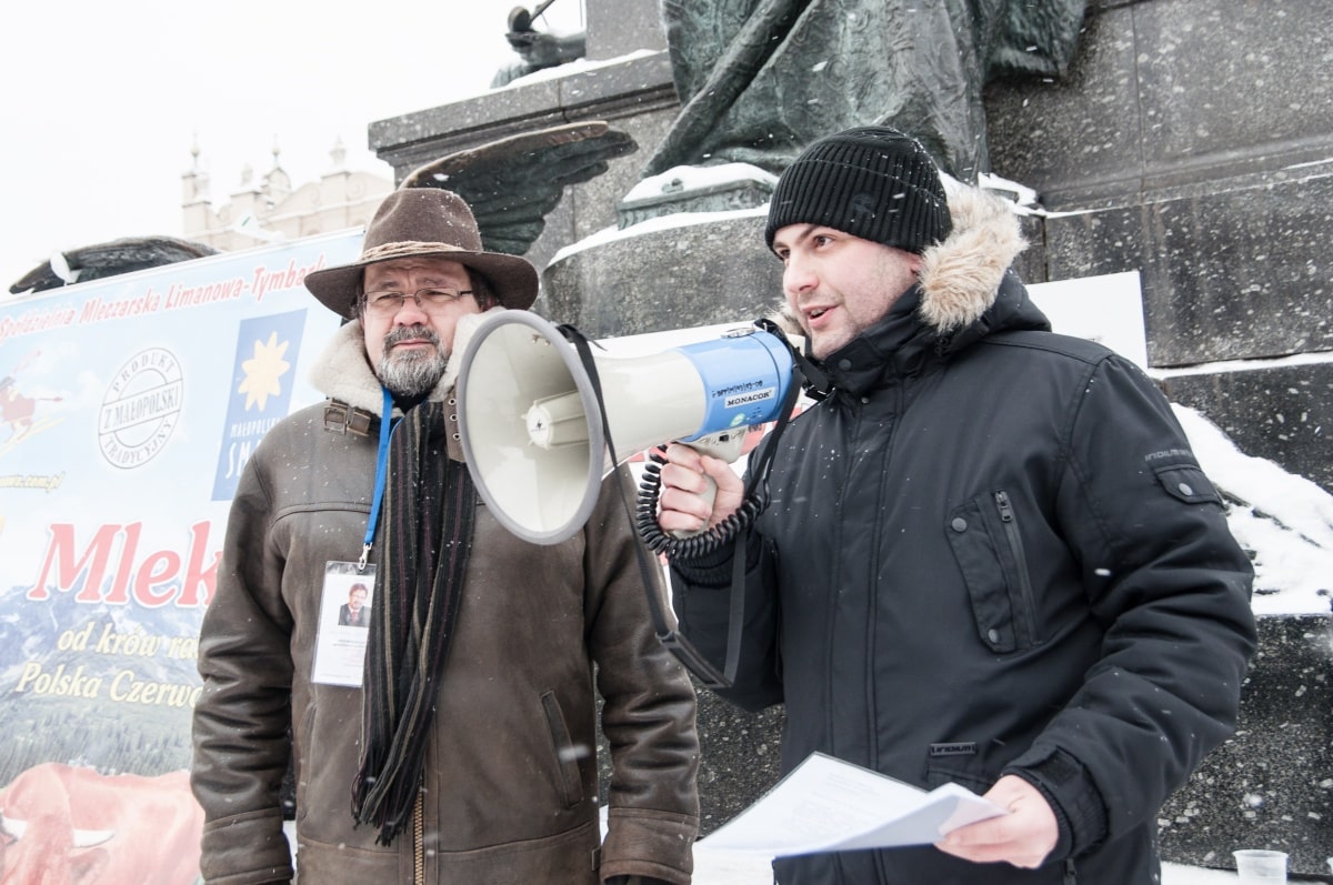 To był prewencyjny protest – przeciwko zapowiadanym przez ministra finansów cięciom dotacji dla barów mlecznych. W obronie tych skansenów polskiej kuchni tłumnie – mimo trzaskającego mrozu – stawiło się kilkadziesiąt osób. Pili ciepłe mleko przygotowane specjalnie na tę okazję przez spółdzielnie mleczarską. – Następnym razem przywiozę większe bańki, takie na 100 litrów – mówi Władysław Kapitan – prezes spółdzielni. Jest dostawcą mleka do wielu krakowskich barów mlecznych i do protestu nie trzeba było go dwa razy namawiać. – Następnym razem to wjedziemy tu cysterną z mlekiem, jeśli będą chcieli zamknąć nasze „mleczniaki” – odpowiadam prezesowi, któremu pomysł chyba się spodobał.
