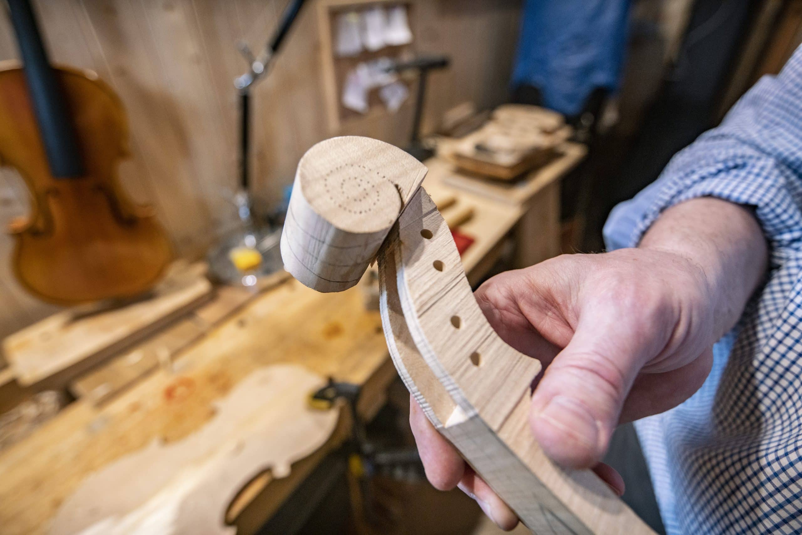 Podstawa to oczywiście materiał, czyli drewno. Ja mam odłożone swoje, które u mnie leżakuje przeszło 30 lat. Jest to sprawdzony i pewny materiał, taki w którym możliwość wystąpienia niespodzianek (np. pęknięć) jest znikoma. Pracuję w świerku i jaworze. Wszystko robi się ręcznie, kliny, boczki, rzeźbi się płytę dolną i górną, a także głowę instrumentu, czyli tak zwanego ślimaka. Jest to proces bardzo powolny. Średnio skrzypce bez malowania buduję około cztery do pięciu miesięcy. Samo malowanie to dodatkowo około dwa miesiące. Na przykład przy malowaniu codziennie dodaję tylko jedną warstwę lakieru, którą się szlifuje, więc ogólnie proces jest długofalowy.